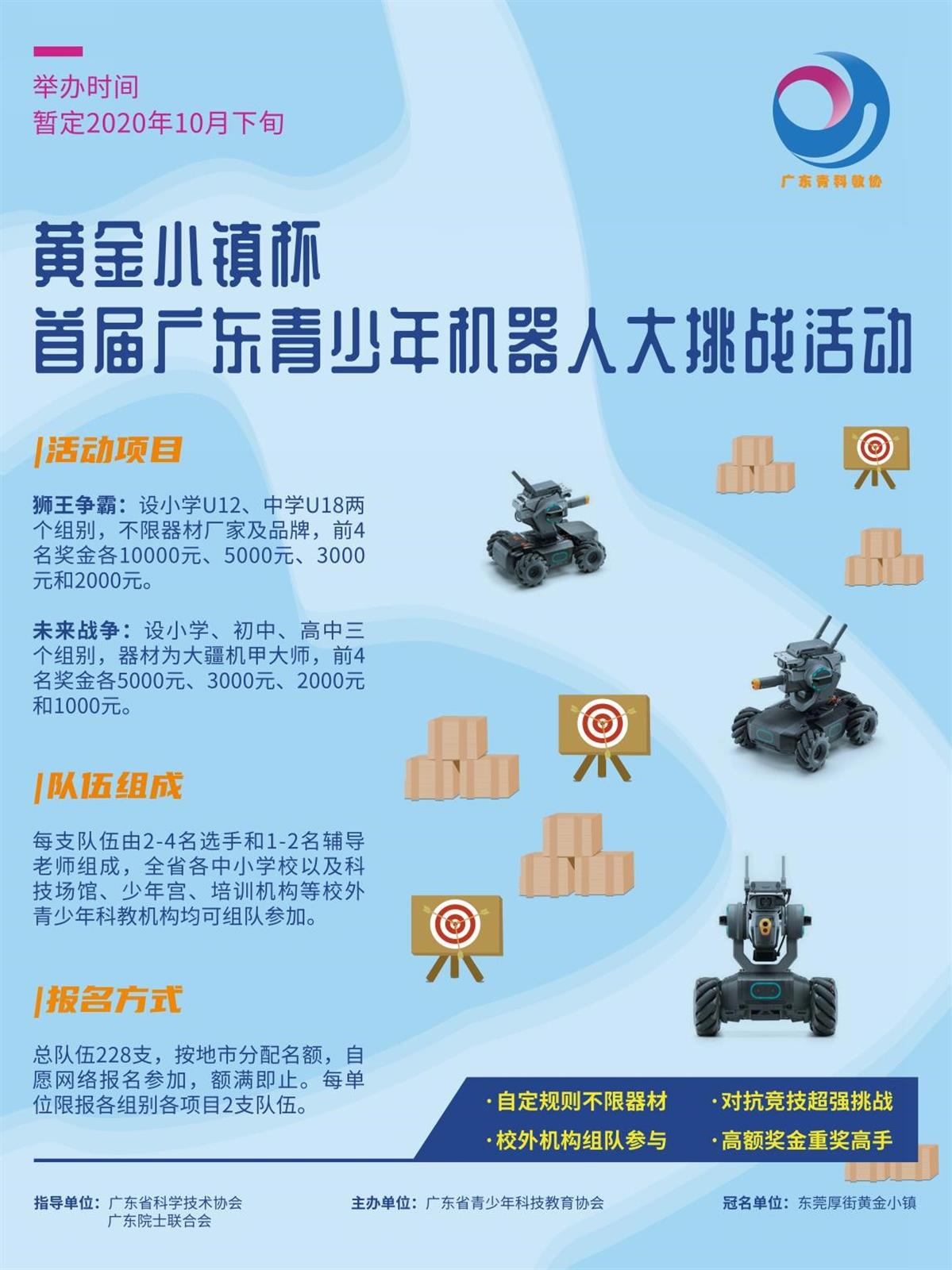 黄金小镇杯首届广东青少年机器人大挑战和第七届广东儿童创意建构大挑战(简称2020年协会两大活动)暂定于2020年10月下旬在东莞市厚街镇黄金小镇举行。