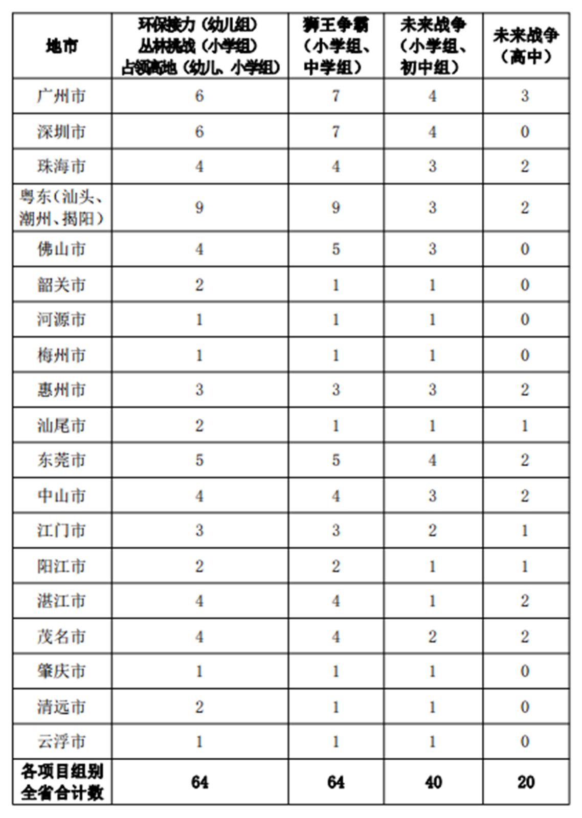 备注:(1)名额分配以广州市为例,环保接力(幼儿组)、丛林挑战(小学组)和占领高地(幼儿组、小学组)共4个组别,各组别名额为6支,共可选拔24支队伍参加省级儿童建构活动;(2)各组别项目的名额数只能减少,不得增加,即广州市幼儿组环保接力名额为6支,可以推荐少于6支,但不能将少推荐的队伍用作其他组别或项目中;(3)深圳、佛山两市已由大疆公司授权当地自行选拔未来战争的高中组队伍参加全国赛,不再从协会省级活动中选拔。