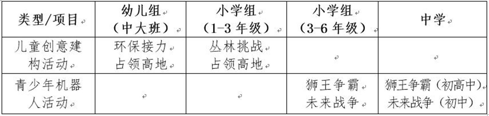 备注:(1)以上项目竞技规则按照省级活动规则;(2)除未来战争指定使用大疆机器人外,其他项目均未指定器材及厂家,符合规则要求即可。