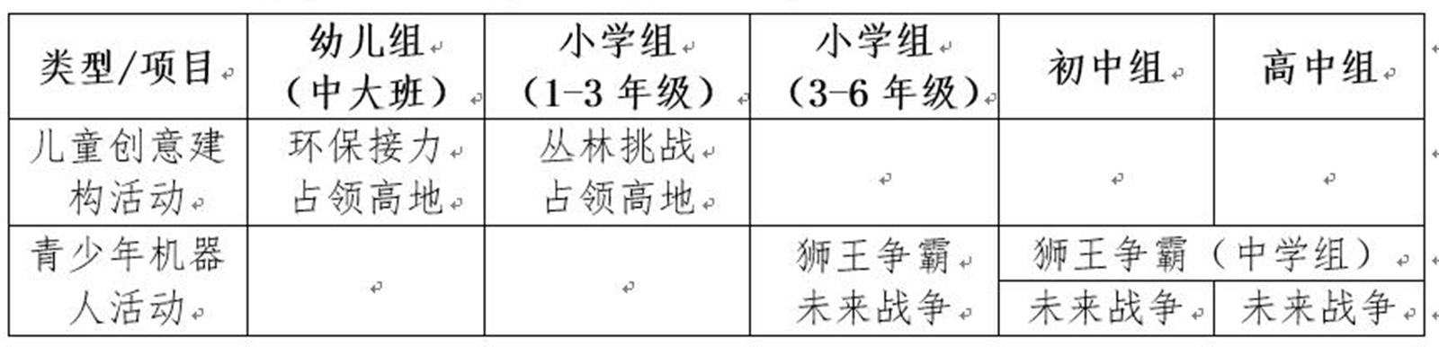 备注:(1)以上项目竞技规则按照省级活动规则;(2)除“未来战争”项目使用大疆机器人外,其他项目均未指定器材及厂家,符合规则要求即可;(3)报名队伍数不足3支,不再现场竞技。