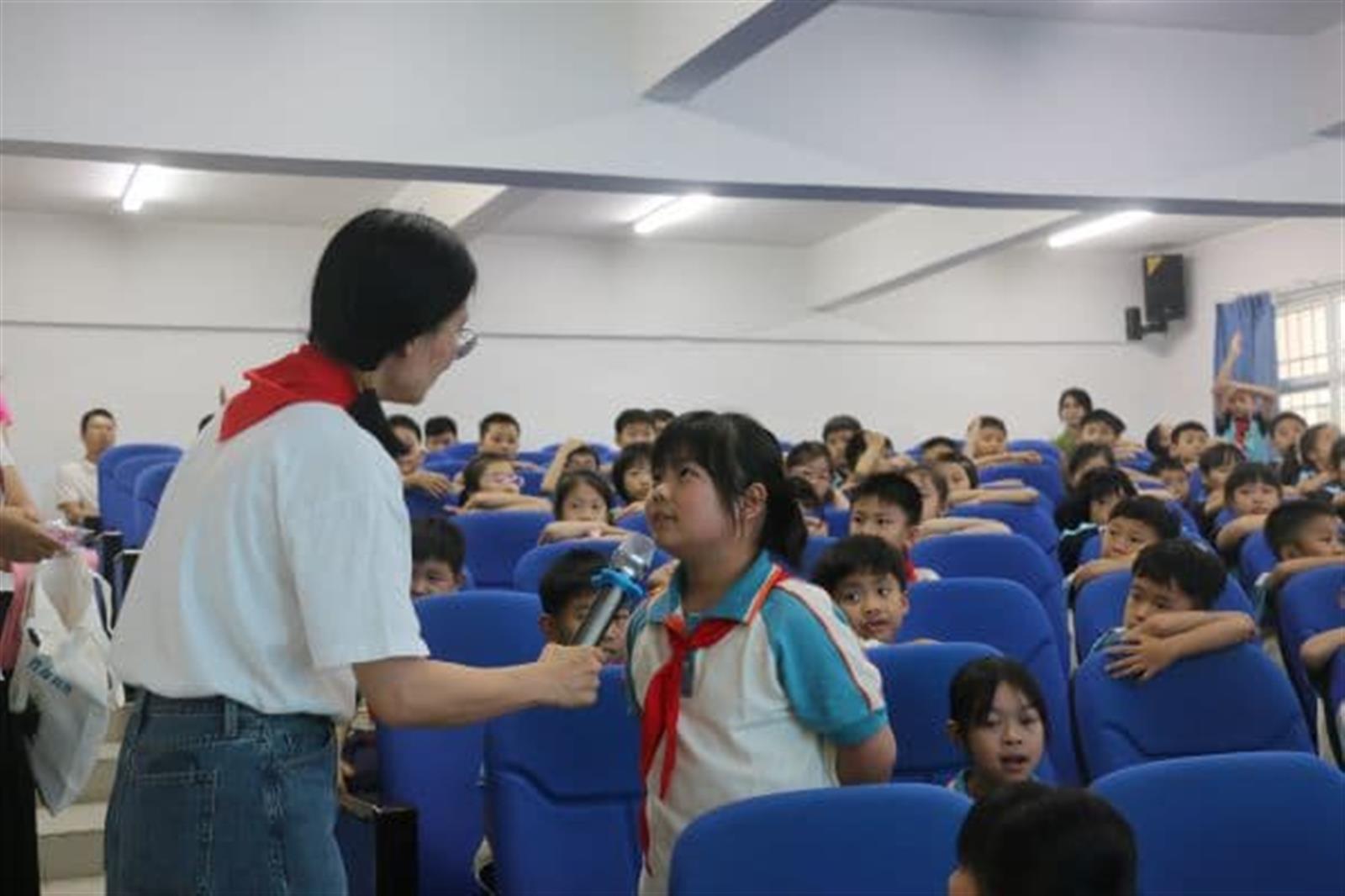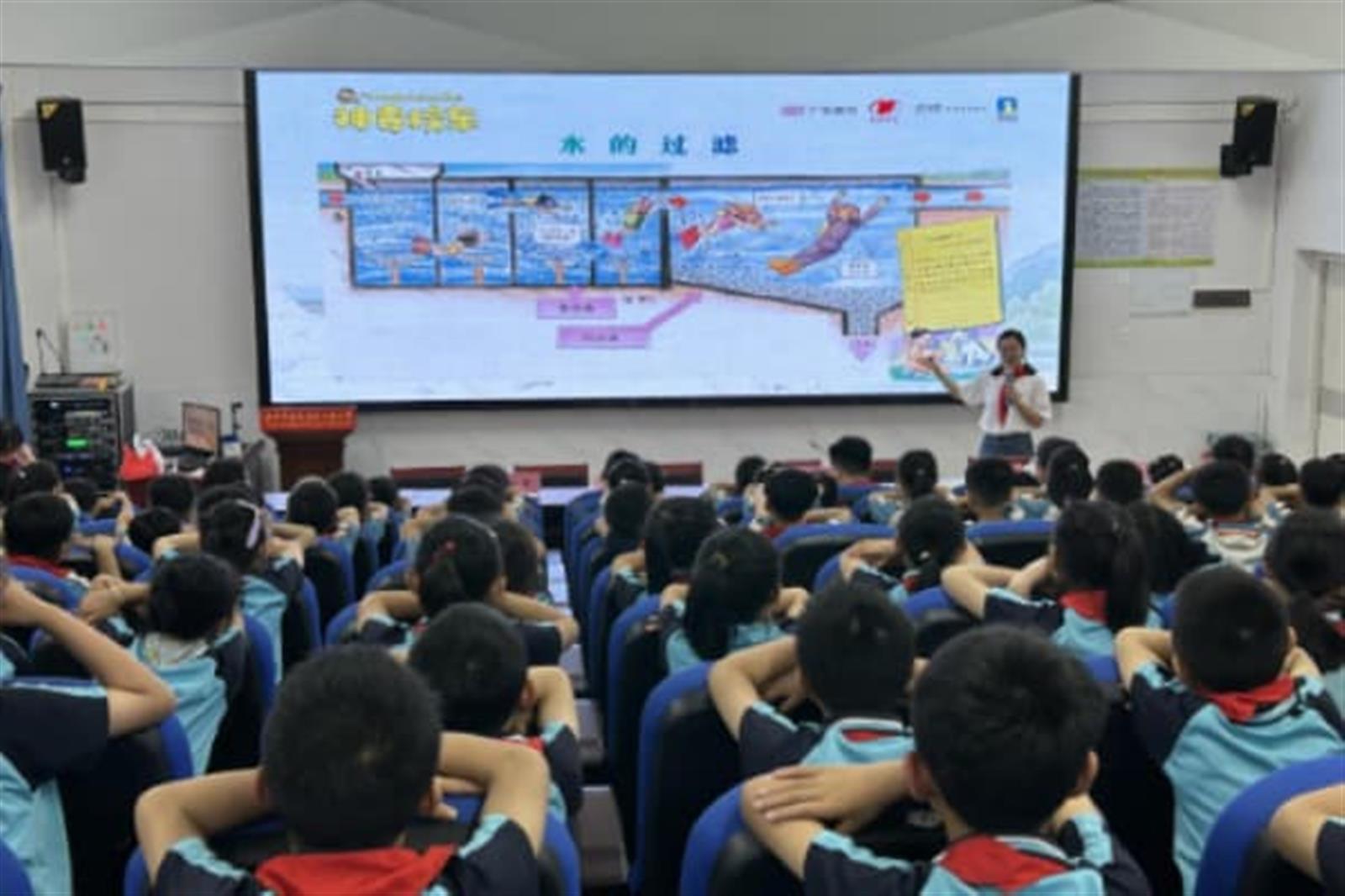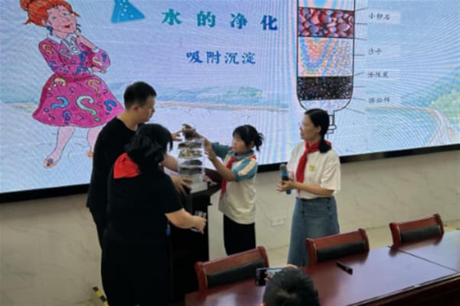 讲座中,为了让同学们更直观地感受到水资源保护的重要性,周老师用沙石、活性炭和滤棉等材料搭建“迷你净水工厂”,当浑浊的污水经过层层过滤变成清澈水流时,同学们都惊呼起来了:原来污水是这样变干净的!周老师利用实验模拟水的净化过程,用流程图梳理水循环路径,成功将抽象科学知识转化为儿童可感知、可操作的体验,向同学们普及了水资源的重要性以及日常生活中节约用水的具体方法。