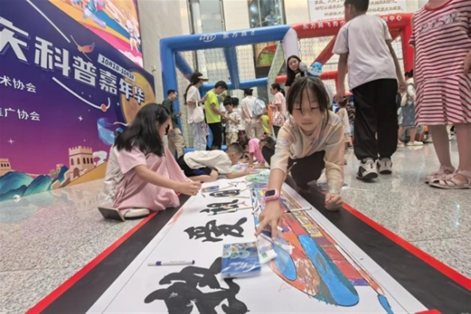 活动现场,孩子们在一副“万人共绘”长卷上挥洒童真童趣,用斑澜色彩为祖国七十六华诞献礼;在VR体验区浑然忘我,感触虚拟与现实交织的魔幻与奇妙;在机器人对抗赛中欢呼雀跃,赞叹人工智能交互功能的强大;在非遗皮影展位流连忘返,打开传承发展新视野……每个展位都成为大家激发创造力和想象力、探索科学奥秘、畅享科技魅力的乐园。